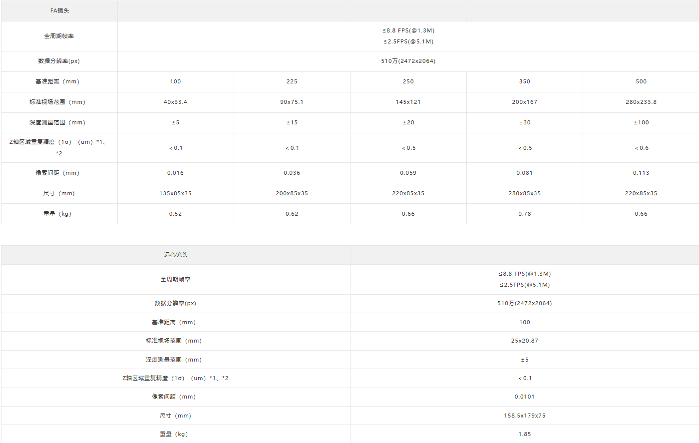 擁有一手掌握超小體型的同時(shí)還擁有著不凡的綜合實(shí)力。數(shù)據(jù)分辨率可達(dá)510萬(wàn)像素(2472x2064px),最高幀率可達(dá)8.8FPS,Z軸區(qū)域重復(fù)精度小于0.6um。