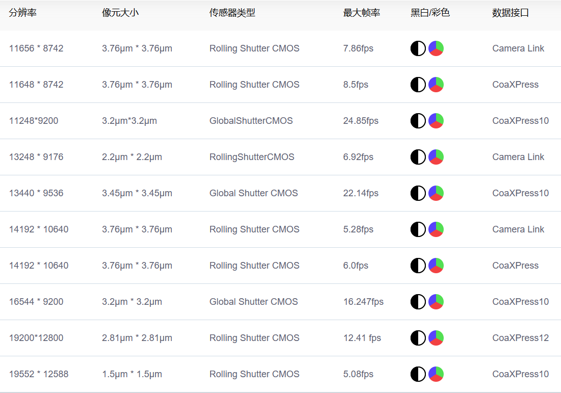 分辨率1.01-13.59億像素,支持Camera Link、CoaXPress等數(shù)據(jù)接口,支持黑白、彩色圖像模式,最高幀率可達24fps,支持像素合并、平場校正、視差矯正、空間校正等多種算法處理技術(shù),支持電子制冷功能。
